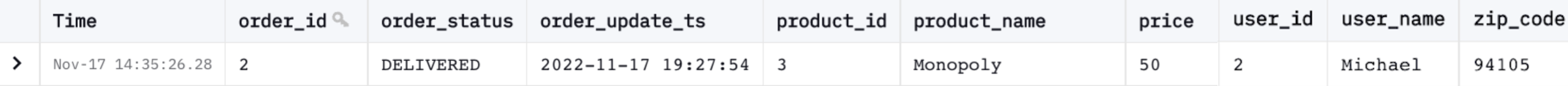 {"before":null,"after":{"order_id":2,"order_status":"DELIVERED","order_update_ts":"2022-11-17 19:27:54","product_id":3,"product_name”:”Monopoly”,”price”:50,”user_id":2,"user_name”:”Michael”,”zip_code”:”94105},”op":"c"}